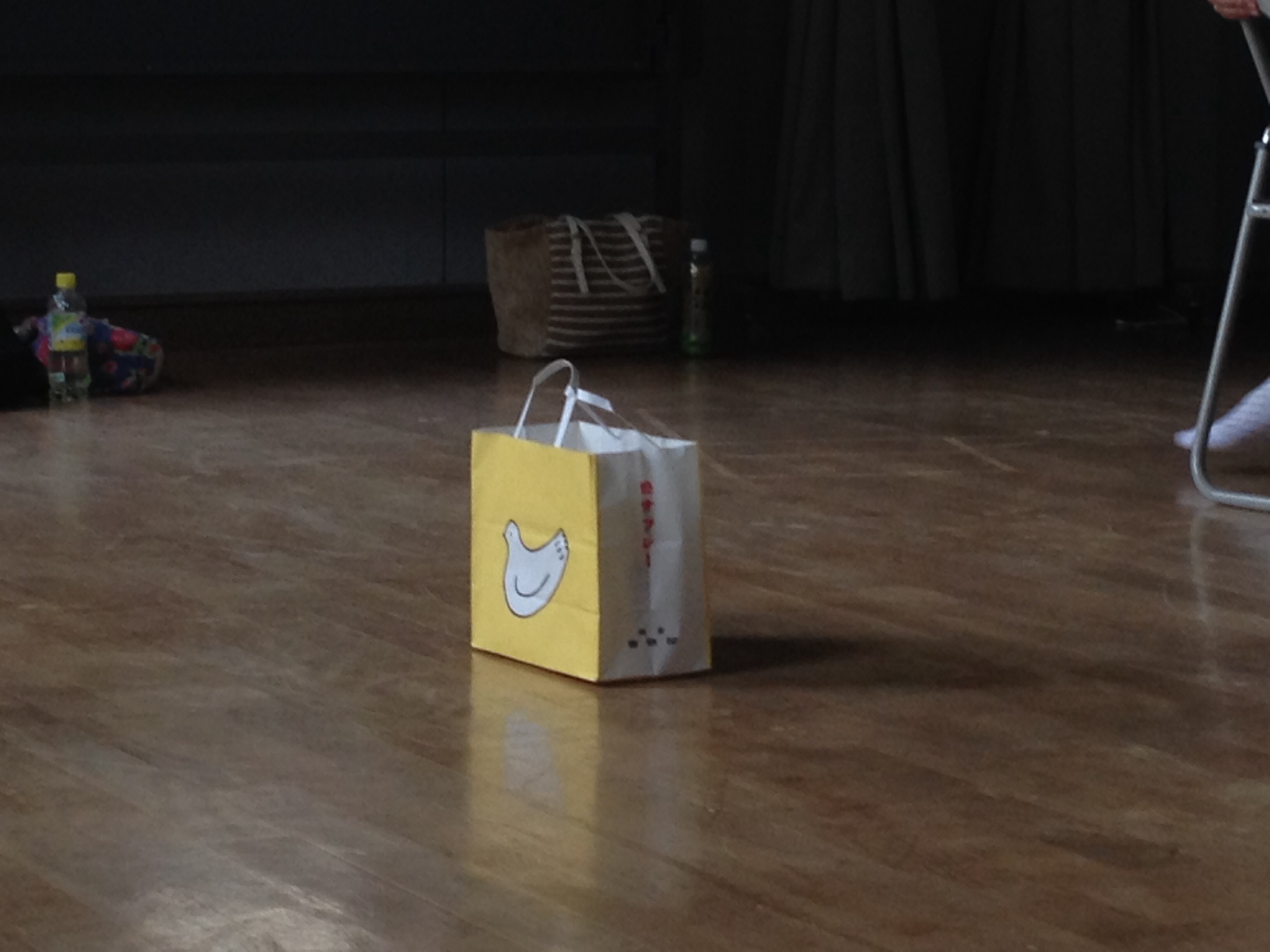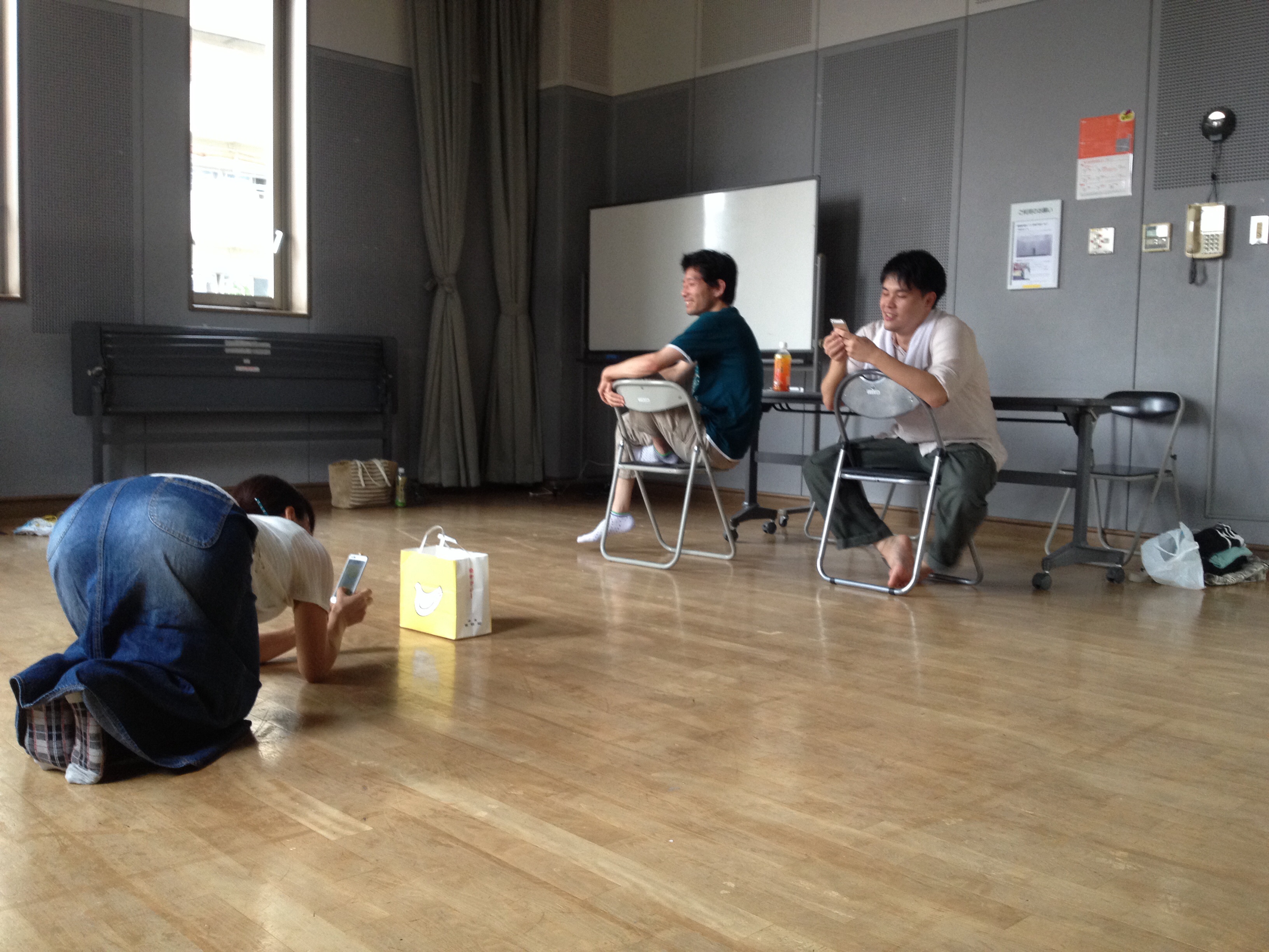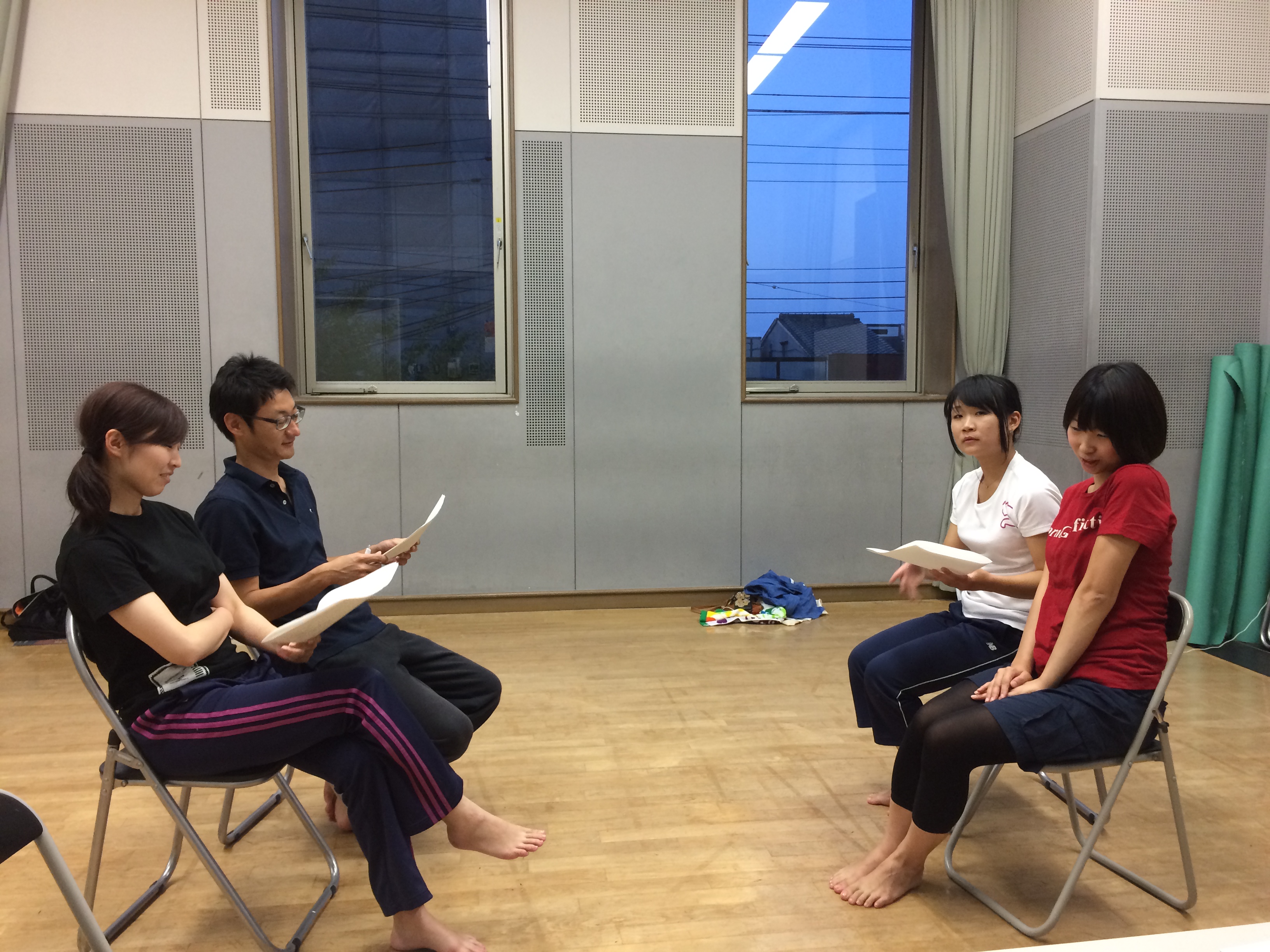 稽古内容は各自柔軟してからの発声、台本の冒頭を読み、ジバ○ャンを書きました。